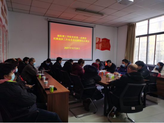 12月28日下午,校党委第一巡察组对离退休工作处党委巡察情况反馈会在处会议室召开。校党委第一巡察组全体成员、离退处全体同志、退休教职工代表参加会议。会议由处党委书记王沛悦同志主持。