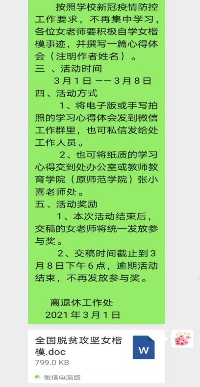 2月25日的全国脱贫攻坚总结表彰大会在京举行,10人当选全国脱贫攻坚楷模,其中有白晶莹、张桂梅、夏森、张小娟、张文秀等5名女楷模。离退休工作处利用微信群号召退休女教职工向女楷模学习,汲取榜样力量、弘扬榜样精神。