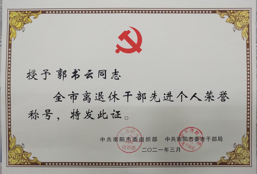 近日,中共南阳市委组织部、中共南阳市委老干部局对全市离退休干部先进个人进行了表彰,我校退休教师郭书云被授予“全市离退休干部先进个人”称号,并在表彰会上发言。