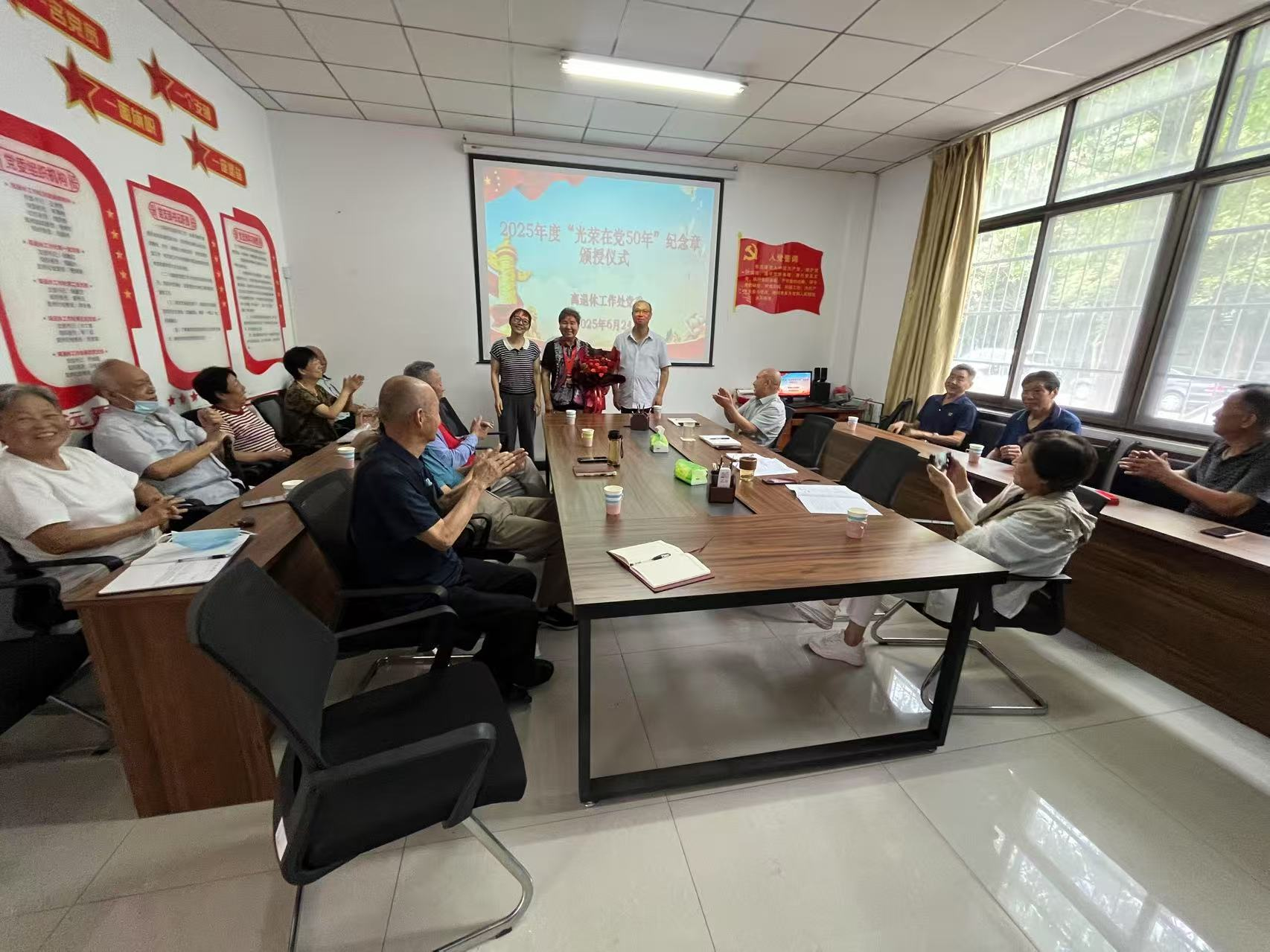 活动第二阶段,开展集体政治生日活动。组织老党员重温入党誓词,举行“光荣在党50年”纪念章颁授仪式,为老党员孙偑芳老师颁授“光荣在党50年”纪念章。
